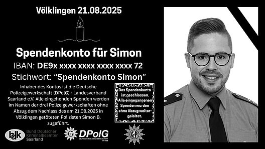Inhaber des Kontos ist die Deutsche Polizeigewerkschaft (DPolG) - Landesverband Saarland e.V. Alle eingehenden Spenden werden ohne Abzug dem Nachlass des am 21.08.2025 in Völklingen getöteten Polizisten Simon B. zugeführt.