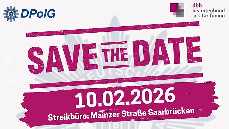 Archiv Archiv 2026Seite 1 von 1. 1 16. Januar 2026 Streikaufruf des dbbWarnstreik am 10.02.2026Der dbb ruft im Rahmen der TV-L-Einkommensrunde 25/26 zum Warnstreik und zur Teilnahme an einer Kundgebung vor der…mehr 05. Januar 2026 Pressemitteilung 1/26Investitionen in die Sicherheit der Polizei: Guter Start ins Jahr 2026Die Deutsche Polizeigewerkschaft (DPolG) Saarland begrüßt ausdrücklich die zu Jahresbeginn 2026 gestarteten Investitionen des…mehrSeite 1 von 1. 1